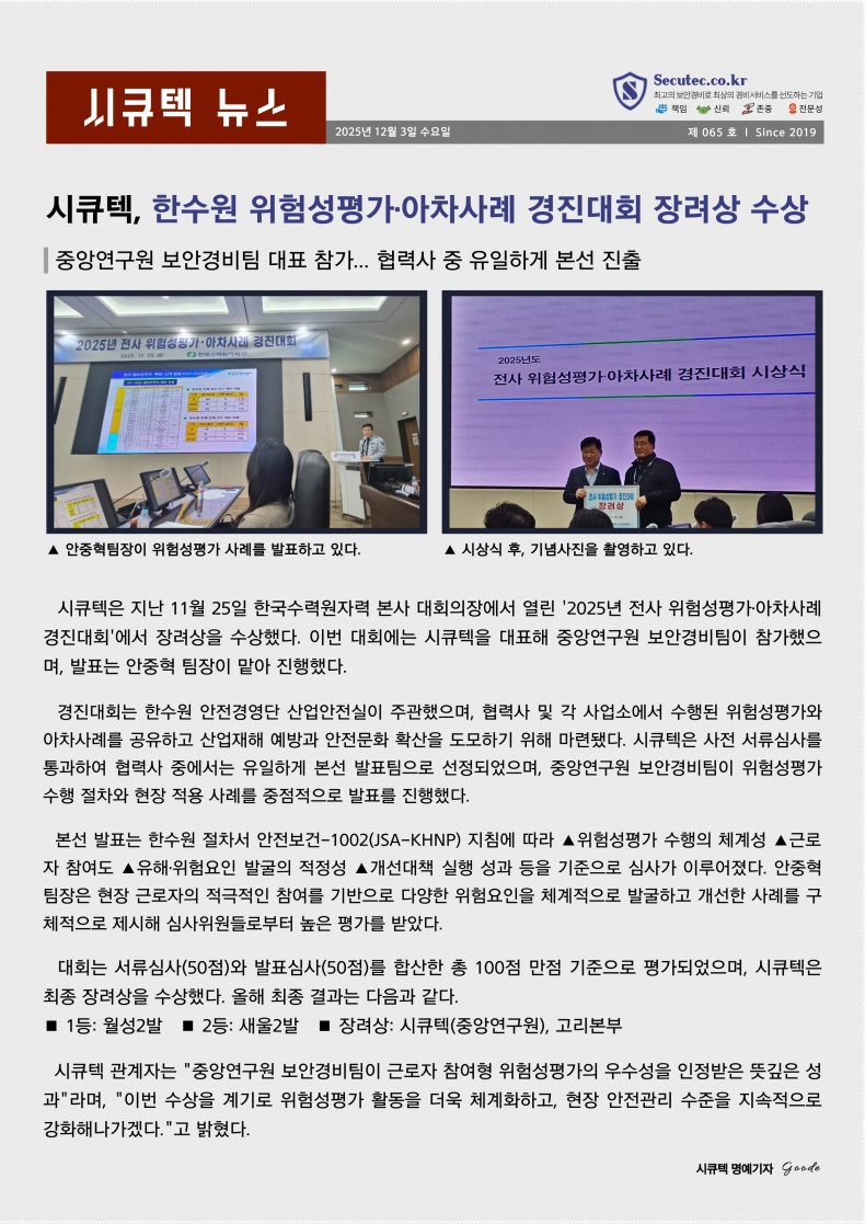 시큐텍, 한수원 위험성평가‧아차사례 경진대회 장려상 수상 | 관리자 | 31 | 2025-12-03 |