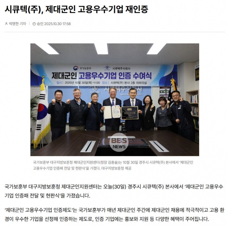관련 보도 링크 BBS NEWS: 시큐텍(주), 제대군인 고용우수기업 재인증 |
