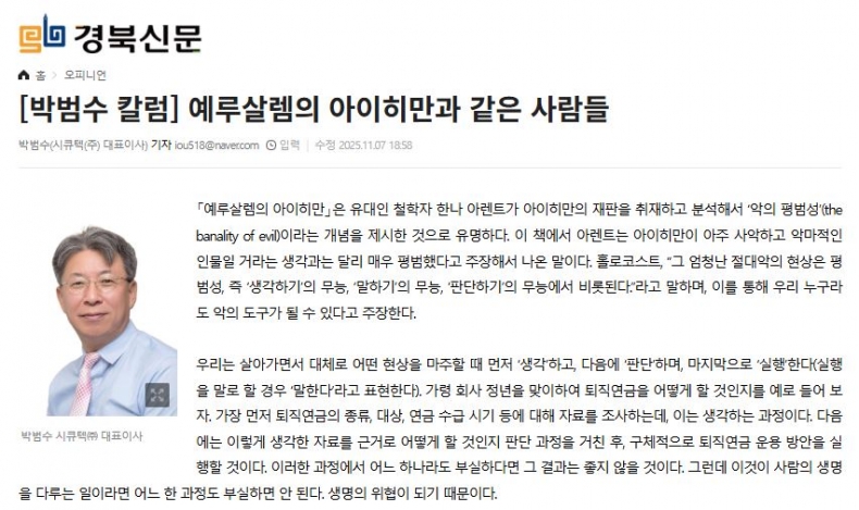 [대표이사 특별기고] 예루살렘의 아이히만과 같은 사람들 | 관리자 | 129 | 2025-11-10 |