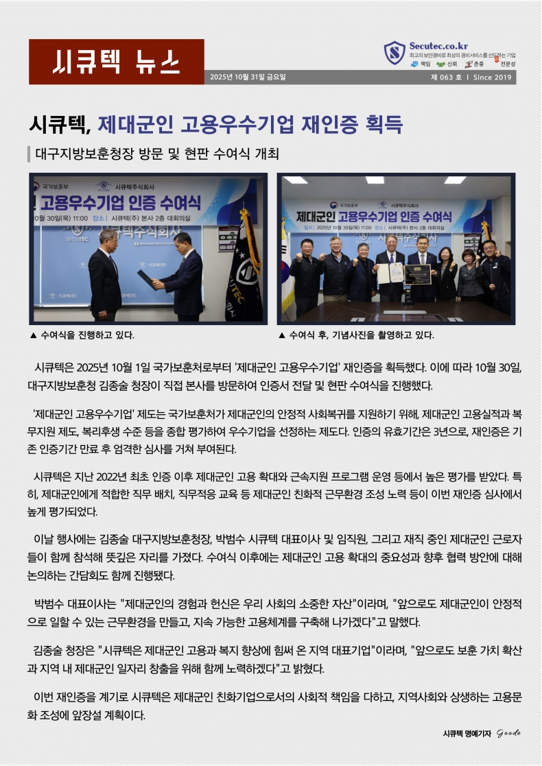 시큐텍, 제대군인 고용우수기업 재인증 획득 | 관리자 | 285 | 2025-10-31 |