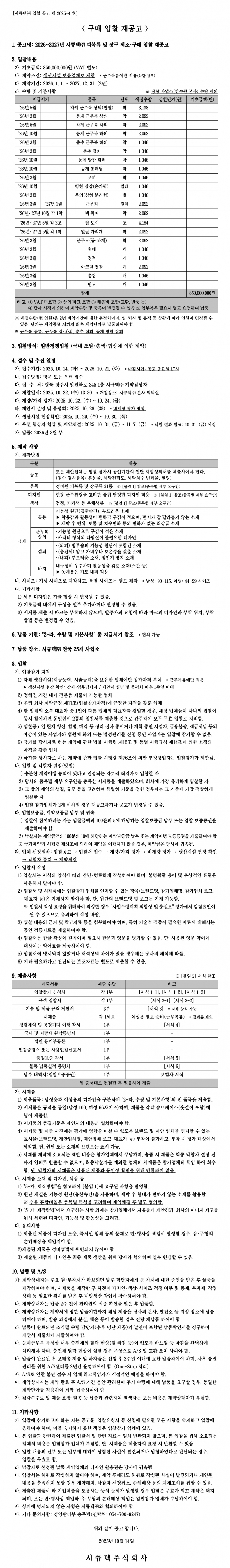 [마감] 피복류 및 장구 제조·구매 입찰 재공고 (~2025. 10. 21.)