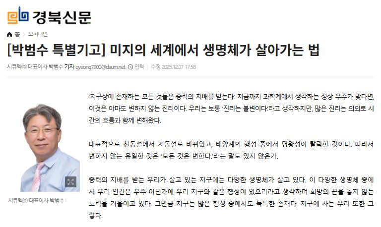 관련 기사 전문 링크 경북신문: [특별기고] 미지의 세계에서 생명체가 살아가는 법 |